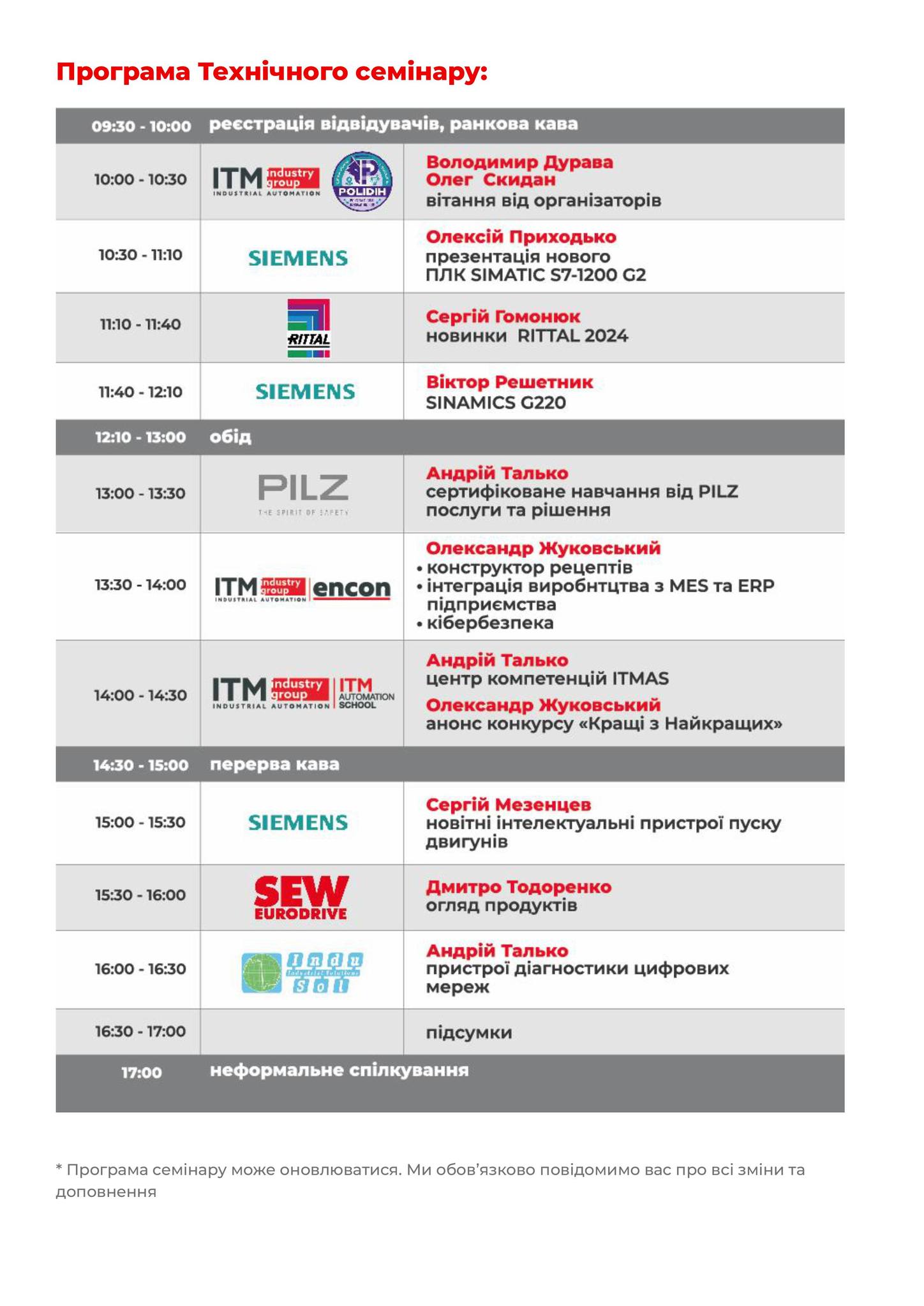 Спікери: запросили експертів топових комппаній – світових лідерів виробників обладнання та рішень для галузі промислової автоматизації з доповідями: