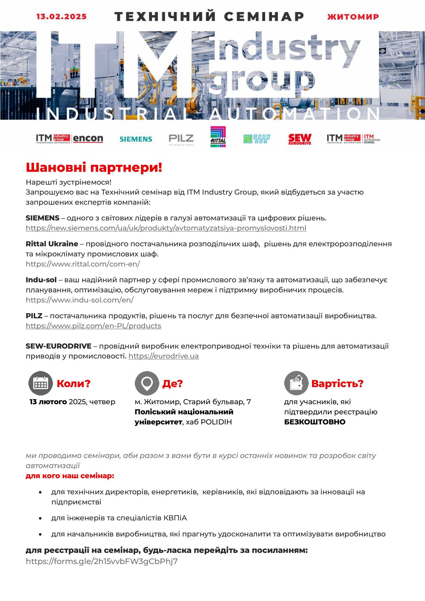 13 лютого 2025 року на базі Поліського цифрового інноваційного хабу POLIDIH проведено технічний семінар від ITM Industry Group, співорганізатором якого також були компанії Encon Ukraine та Центр компетенцій ITMAS ITM Automation School.