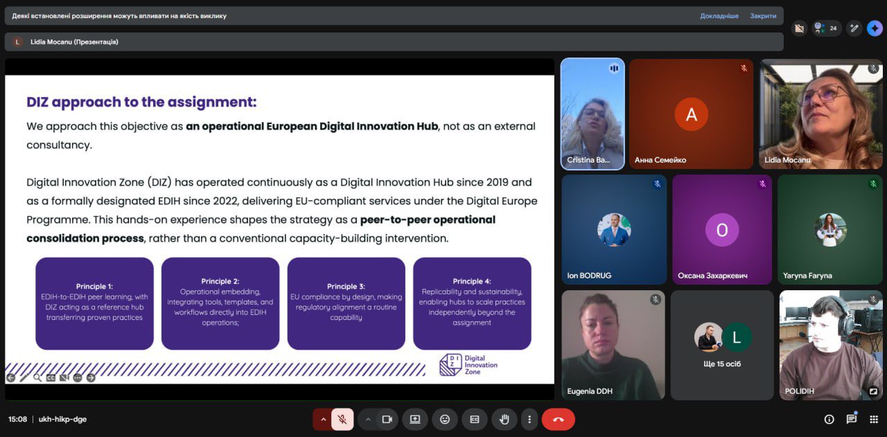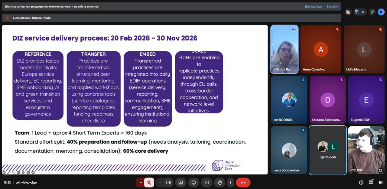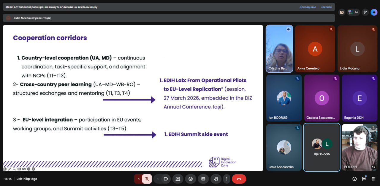 Олександр РОЖКОВ, учасник проєкту POLIDIH, аспірант спеціальності «Менеджмент» долучився до міжнародної онлайн-зустрічі партнерів європейської мережі EDIH. Учасники заходу дізналися про нові можливості співпраці з румунським хабом Digital Innovation Zone, який цього року надаватиме підтримку партнерам з України та Молдови.